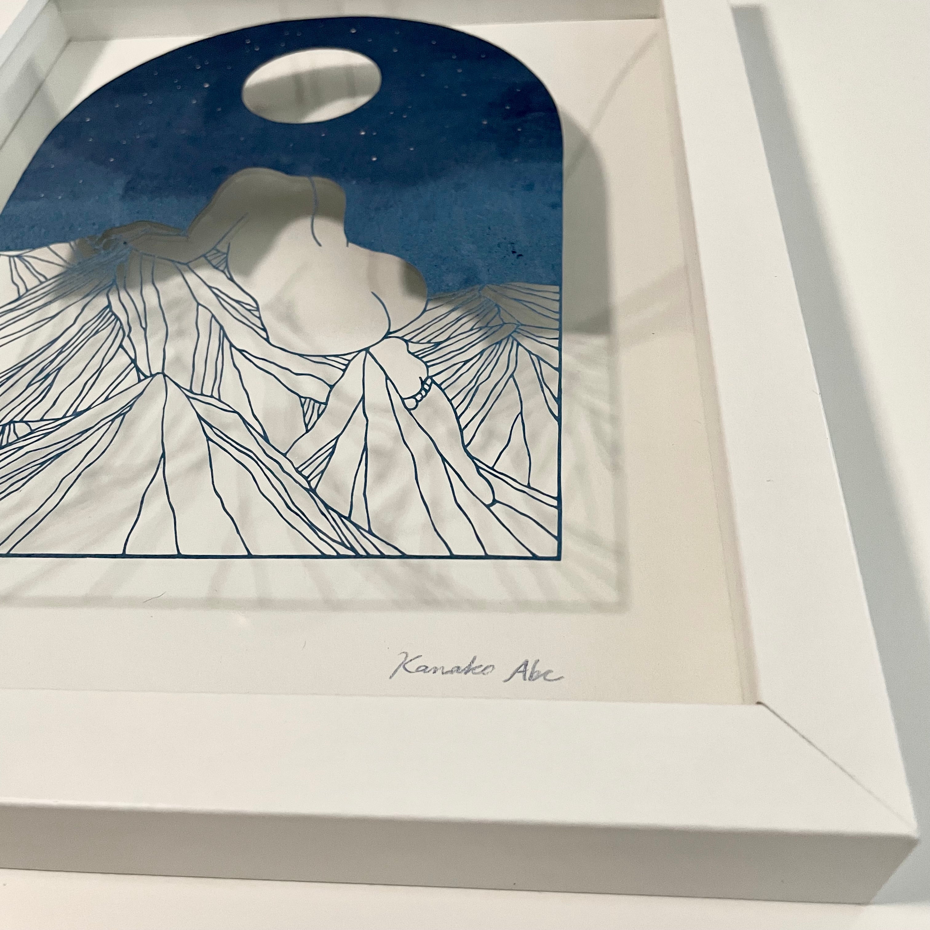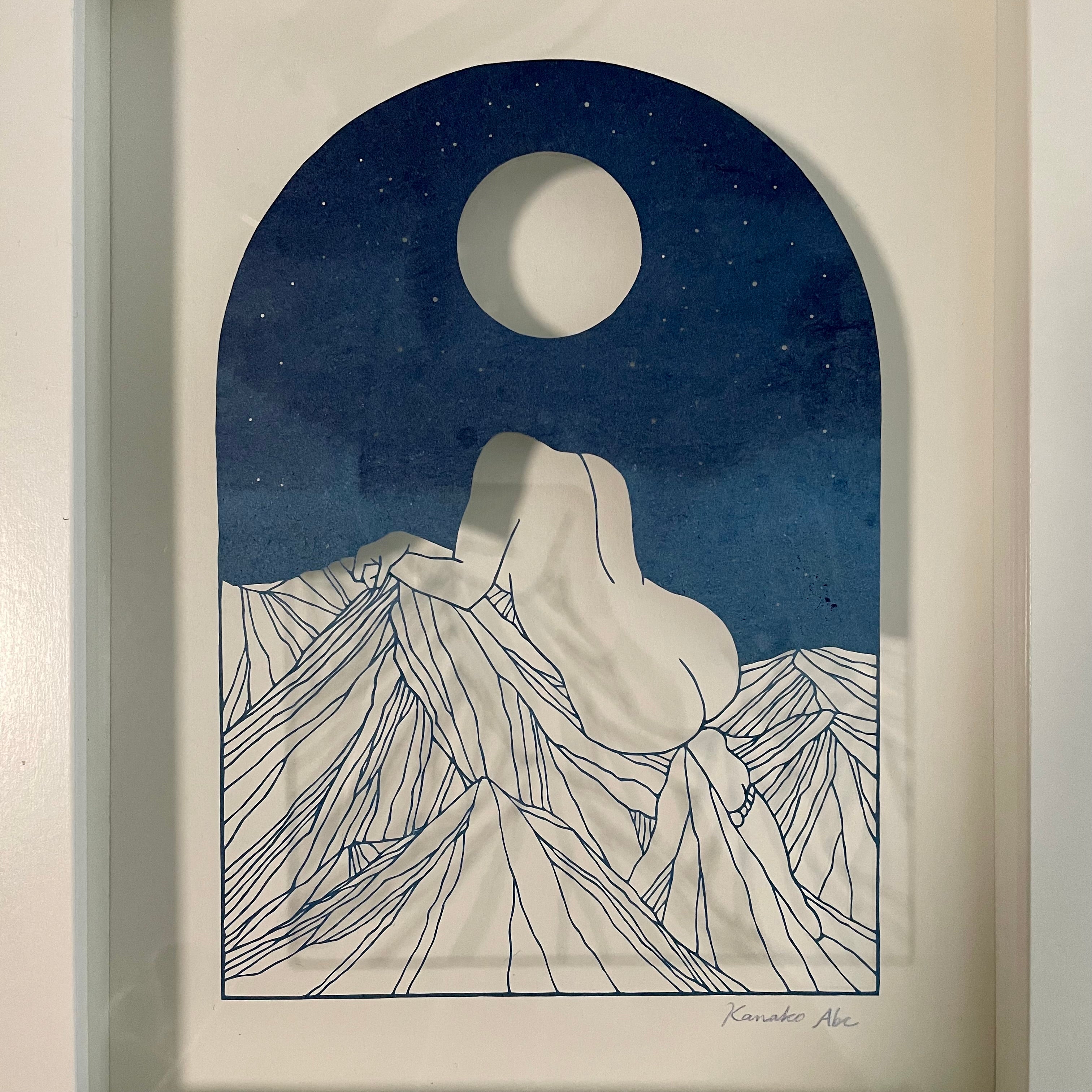 Delicate paper cutting made out of blue dyed paper of a woman's nude body sitting atop of a mountain range. She has no head and is turned away so only her back and butt are showing. A full moon is in the night sky.