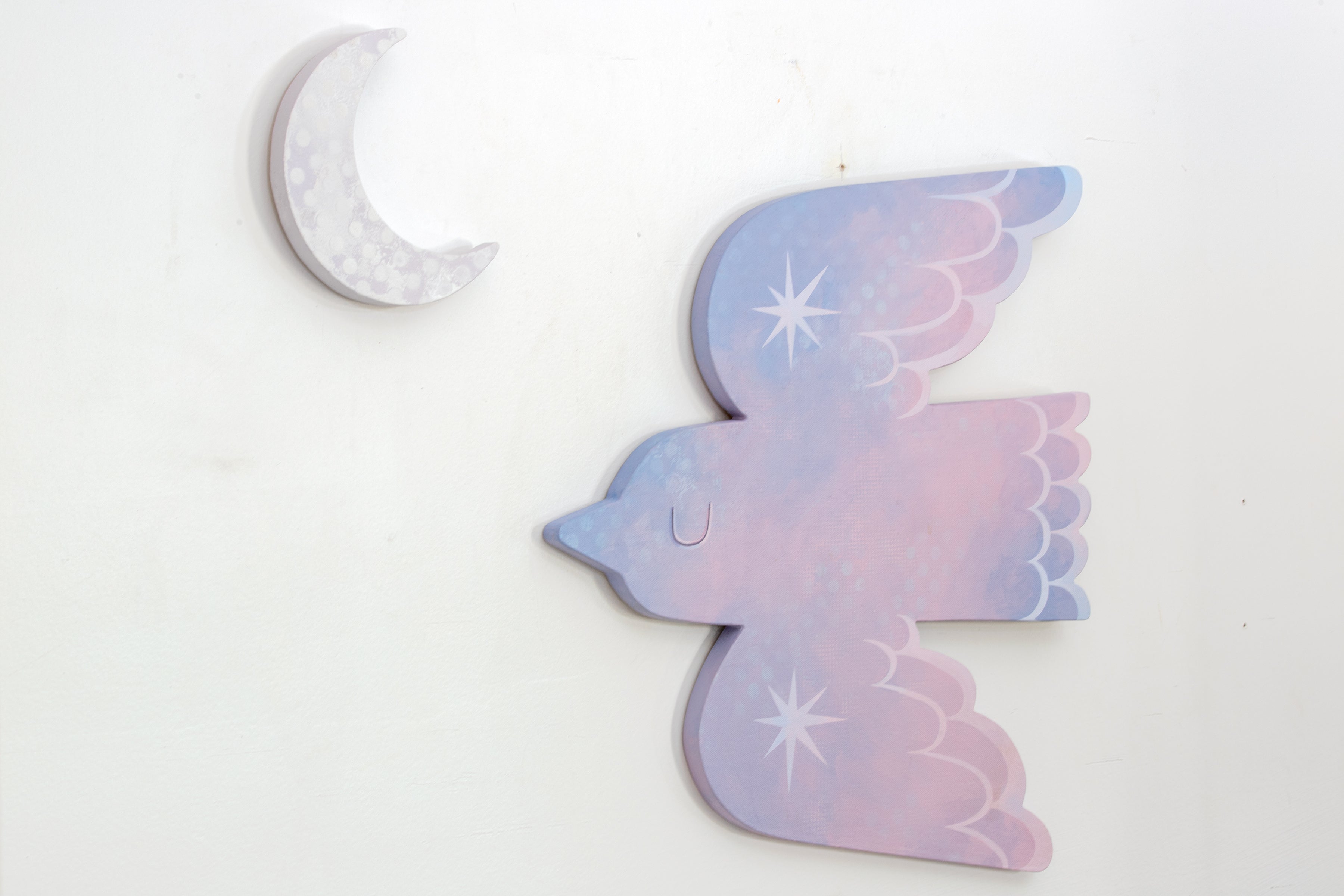 Bird measures 16 x 18 inches, moon measures 5 x 6 inches.