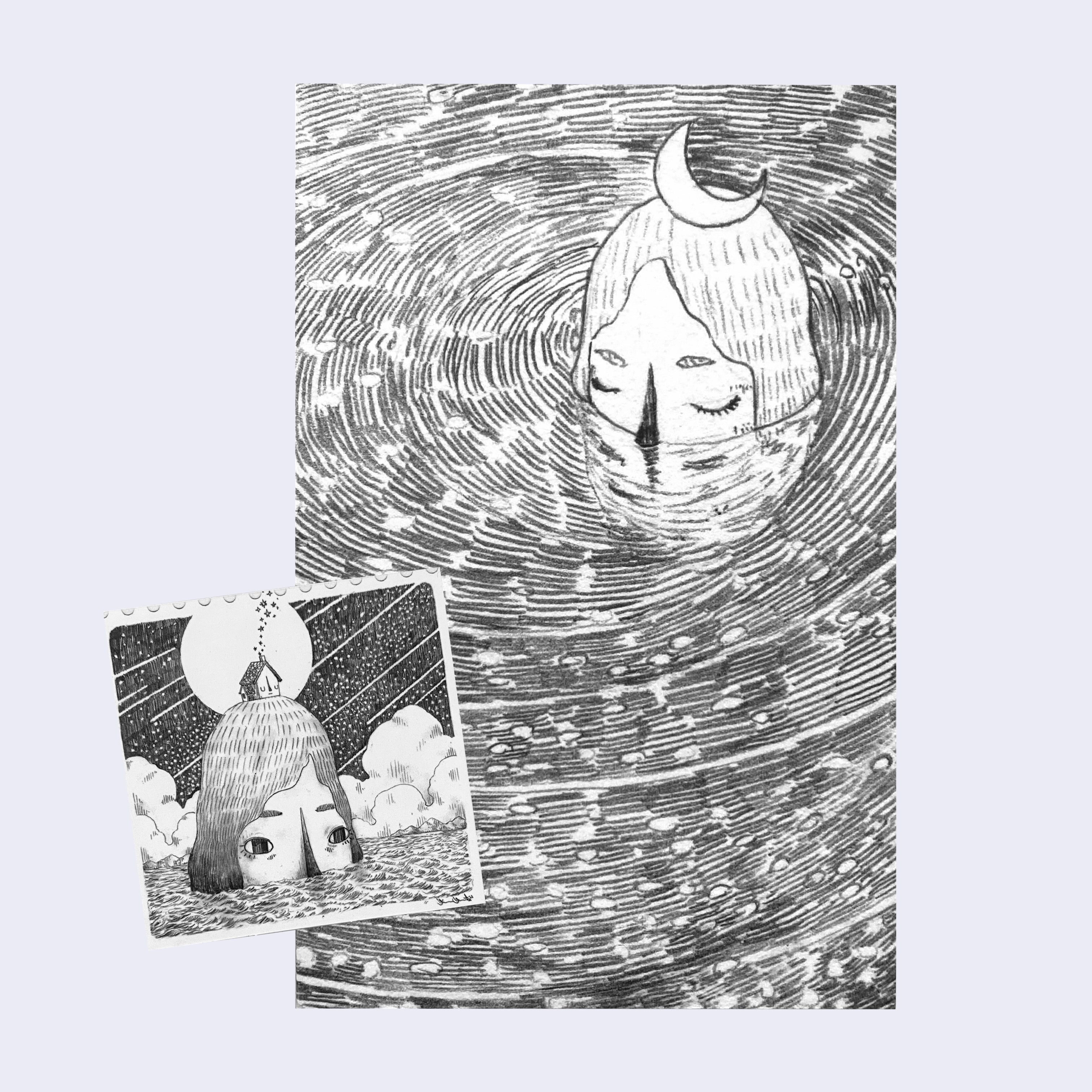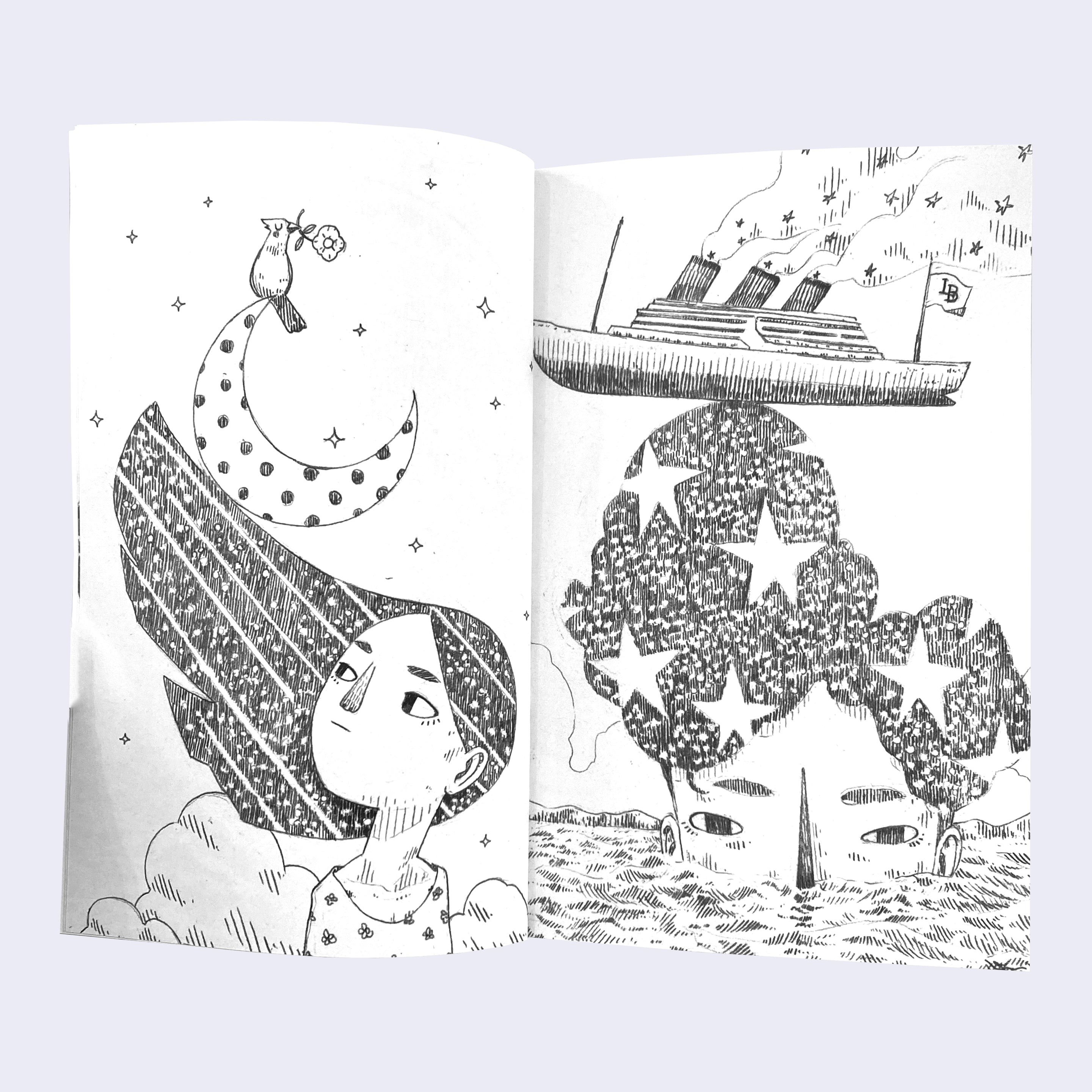 Open spread of black and white pencil drawing zine, featuring an illustration of a girl with long galaxy patterned hair, looking up at a polka dot crescent moon with a bird atop it. The next page has an illustration of a boy with large pompadour style star patterned hair, half submerged in water with a large steam boat atop his head.