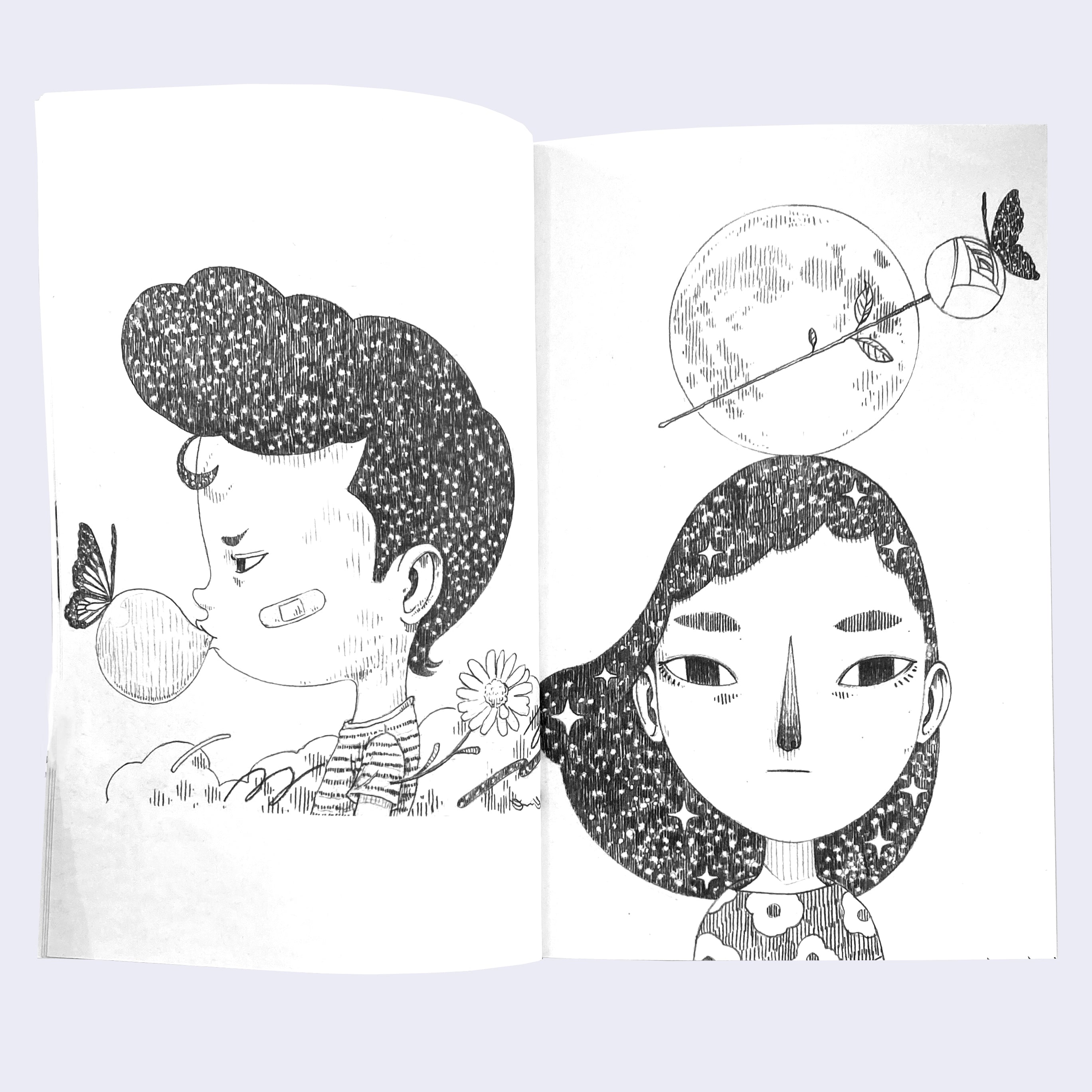 Open spread of black and white zine, featuring a profile view illustration of a boy with fluffy galaxy patterned hair, blowing a bubble with a butterfly landed on it. The next page featuring a similar style illustration of a girl with longer galaxy patterned hair looking solemnly, with a full moon and a stemmed rose atop her head.