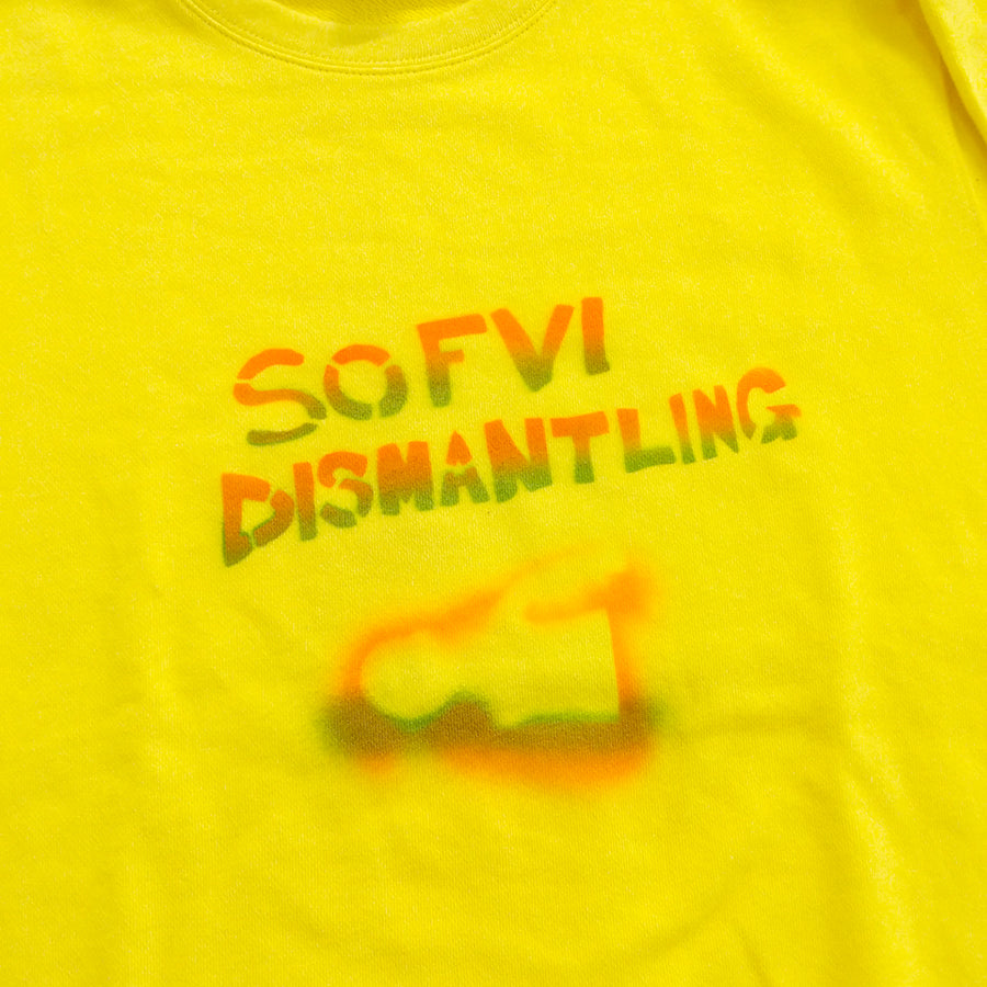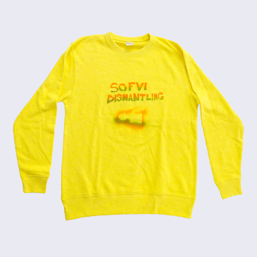 Front of bright yellow crewneck sweatshirt. Center chest area has stenciled text in orange and green gradient that says sofubi dismantling.