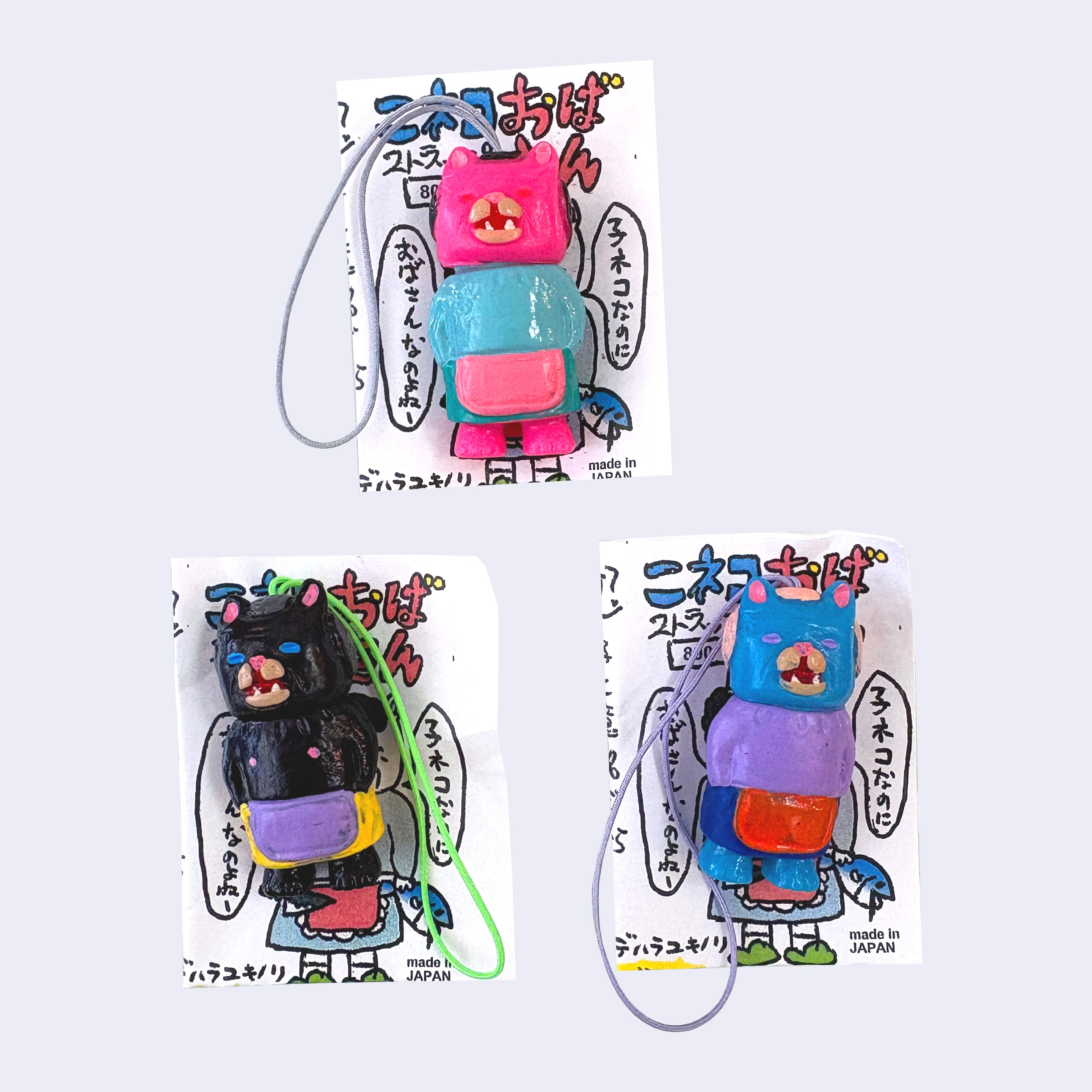 From the boundless imagination of Yukinori Dehara, his iconic Neko Obasan character as a mini charm! Dehara's sofubi figures are always hand painted and as unique as they come.