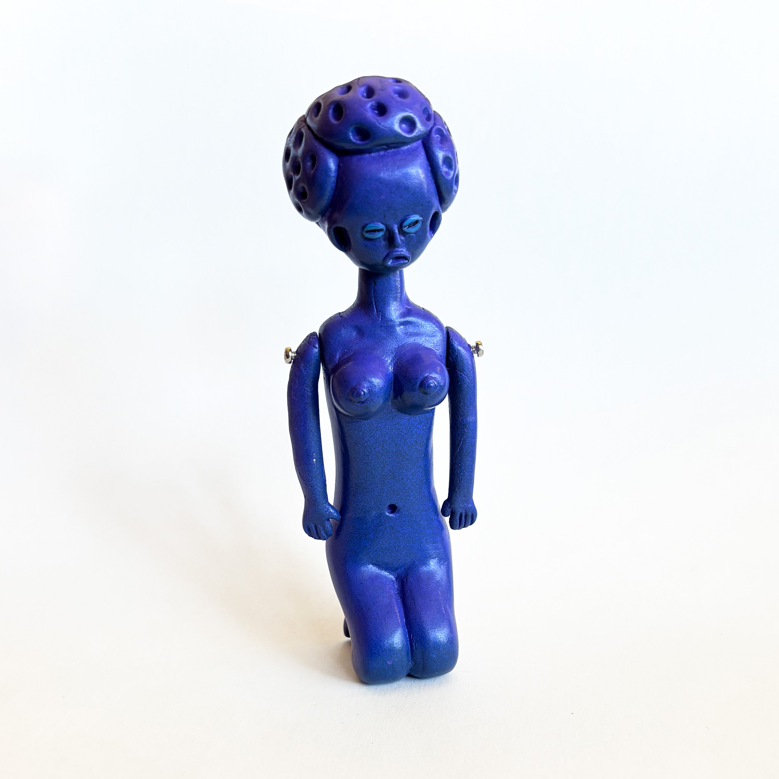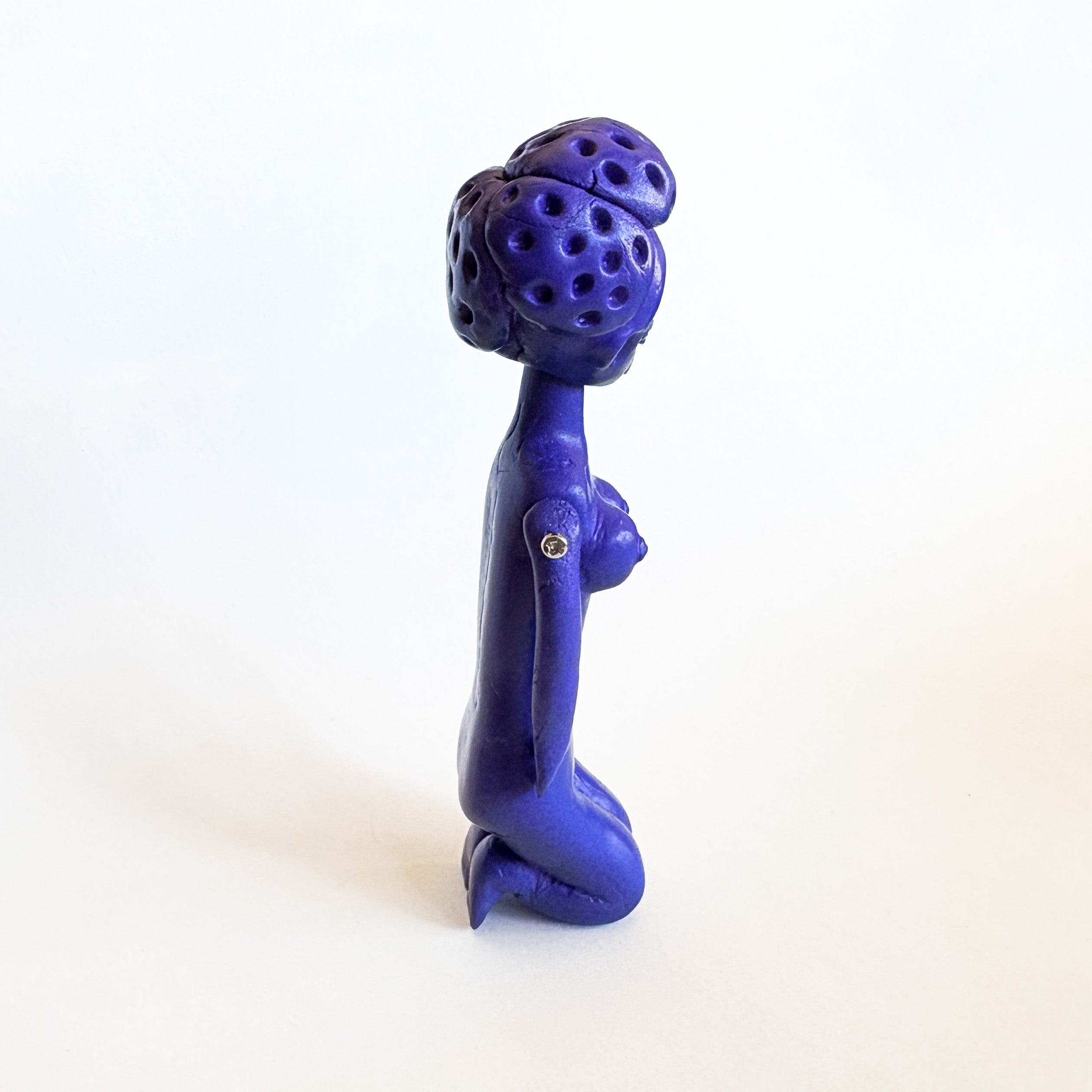 All purple sculpture of a nude woman sitting on her knees, with her arms at her side and a short perm-like hairstyle.
