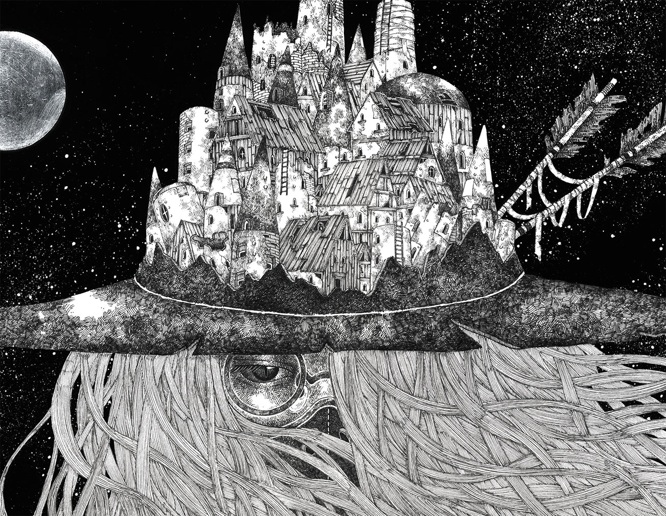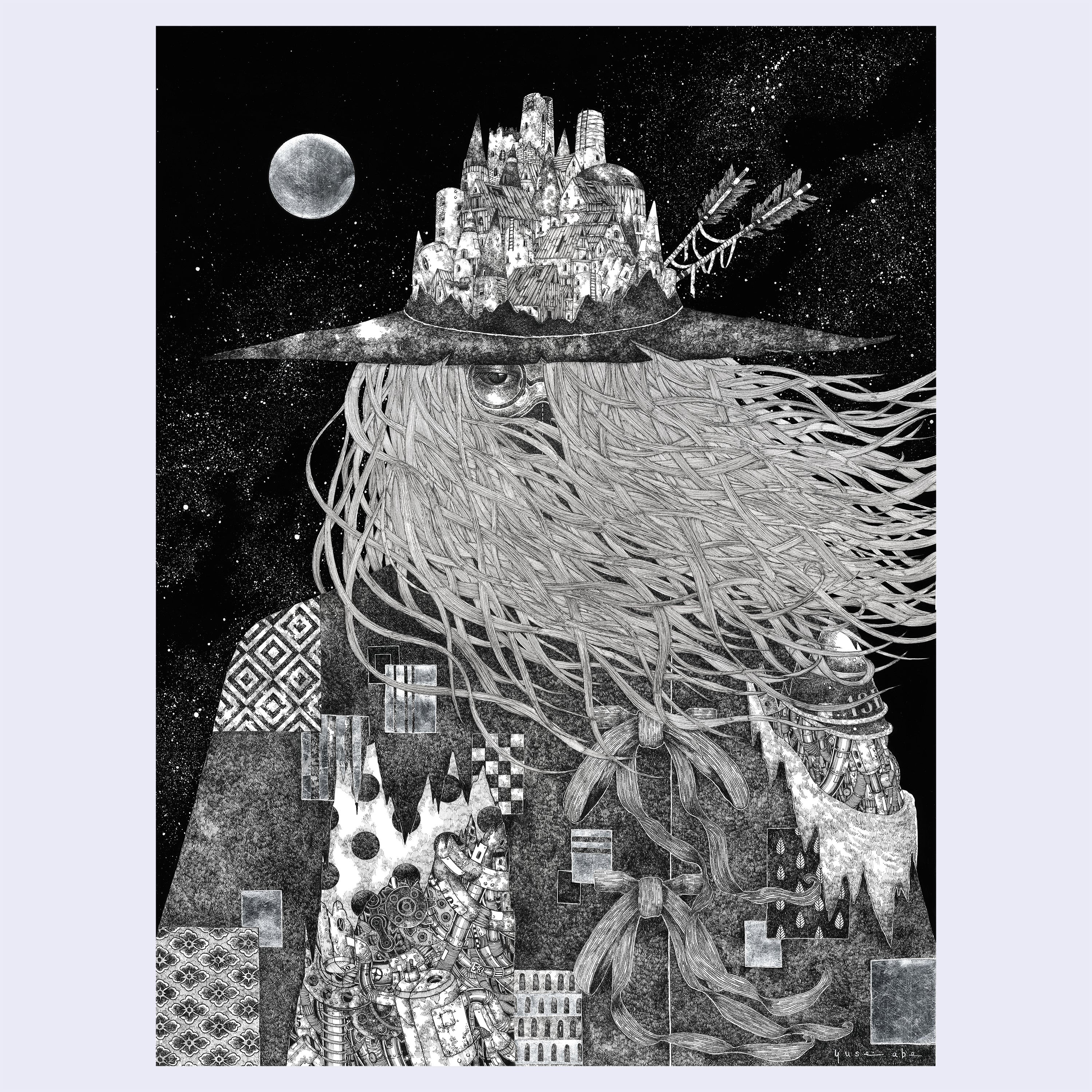Pen, Gouache & Silver Leaf on Illustration Board.