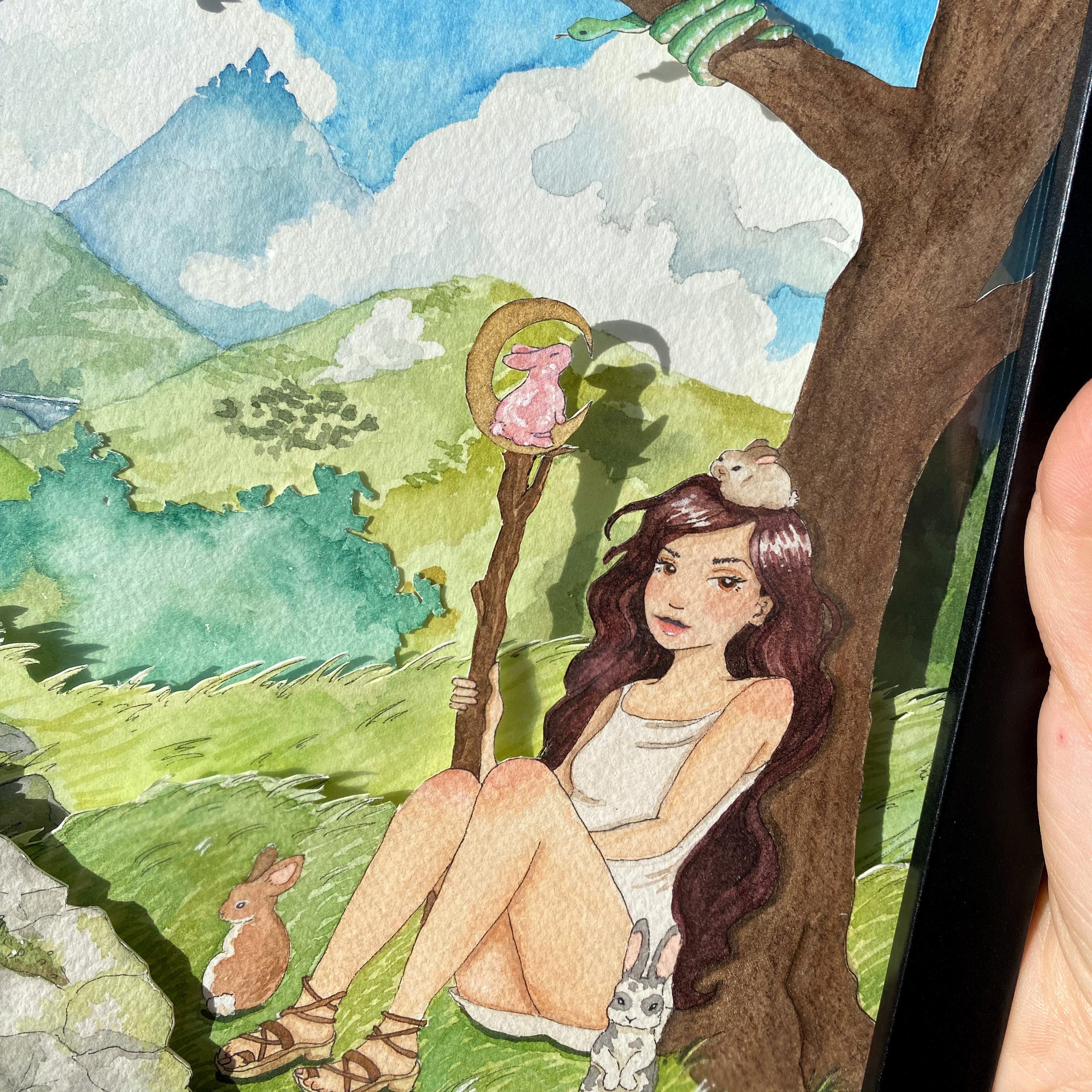 Illustration on several layers of cut and assembled paper of a girl with long brown hair and short white dress sitting against a tree in a grassy, expansive mountainous environment. She holds a staff with a rabbit on it and several small rabbits sit nearby, on high alert.