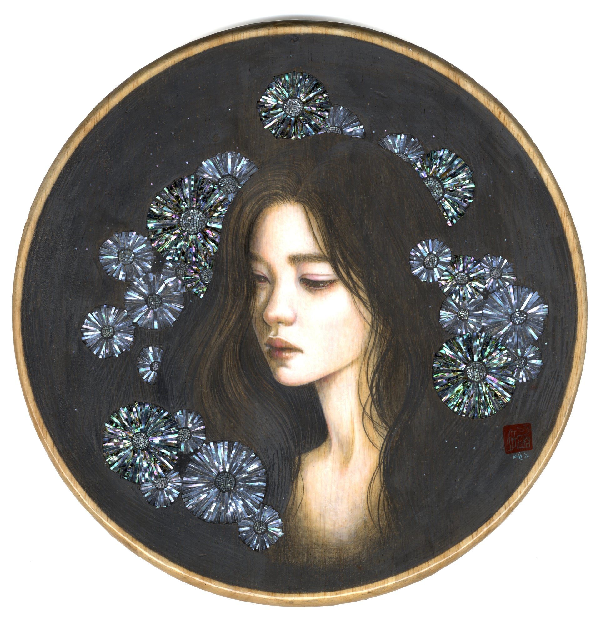 Graphite, Acrylic and Jagae (Korean Abalone & Mother-of-Pearl) on Wood.