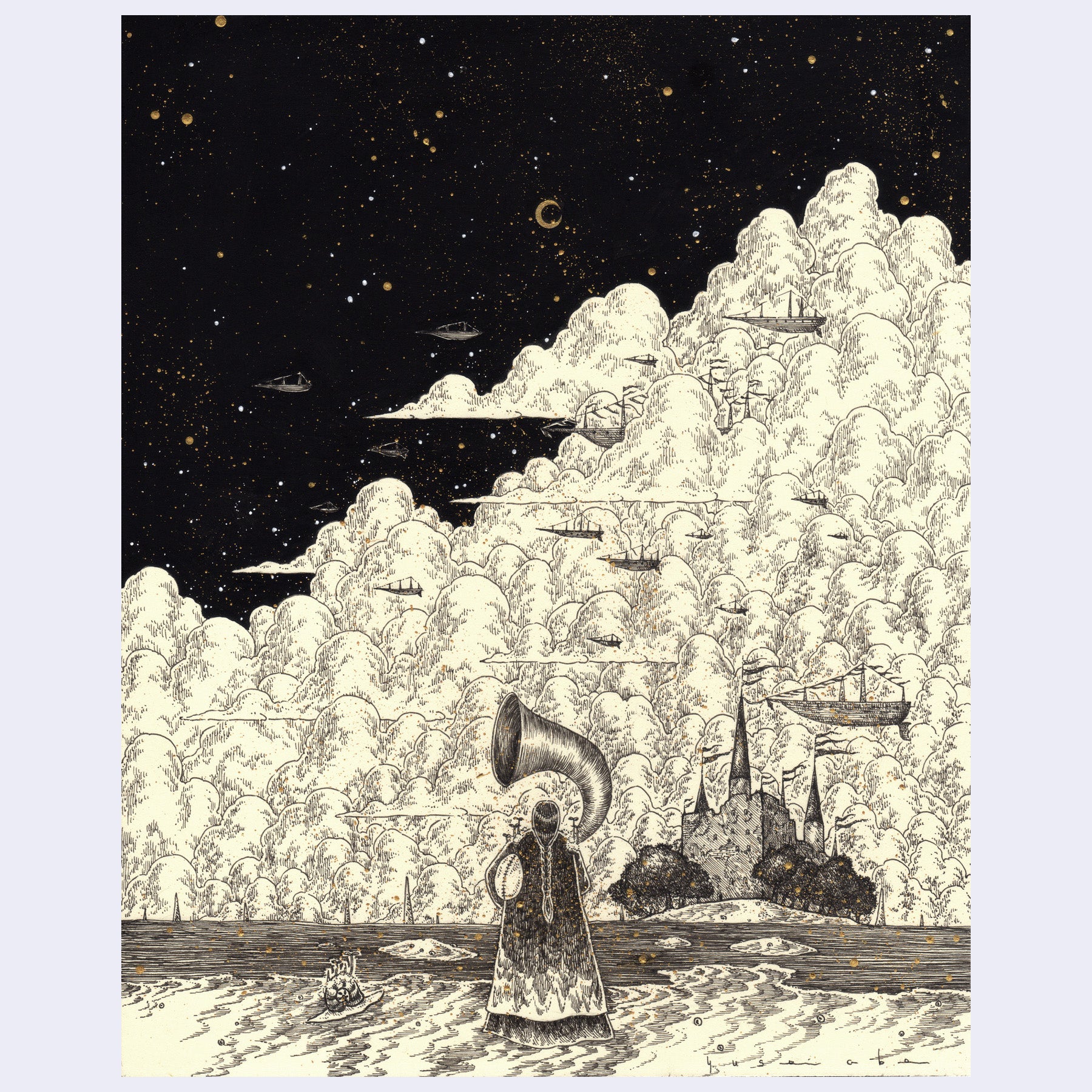 Pen, acrylic gouache and gold ink on washi paper attached on wooden panel